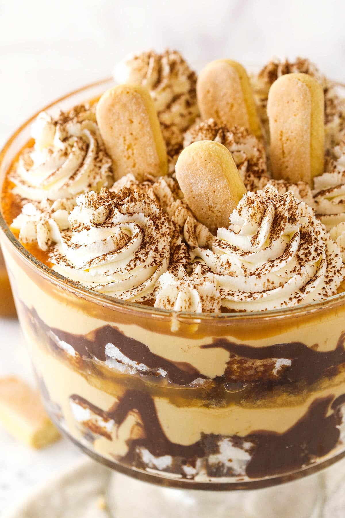 5. Finish the trifle by spreading the remaining plain whipped cream (from step 4) evenly over the top. You can decorate as desired with additional caramel drizzle, chocolate shavings, or a few whole coffee beans.