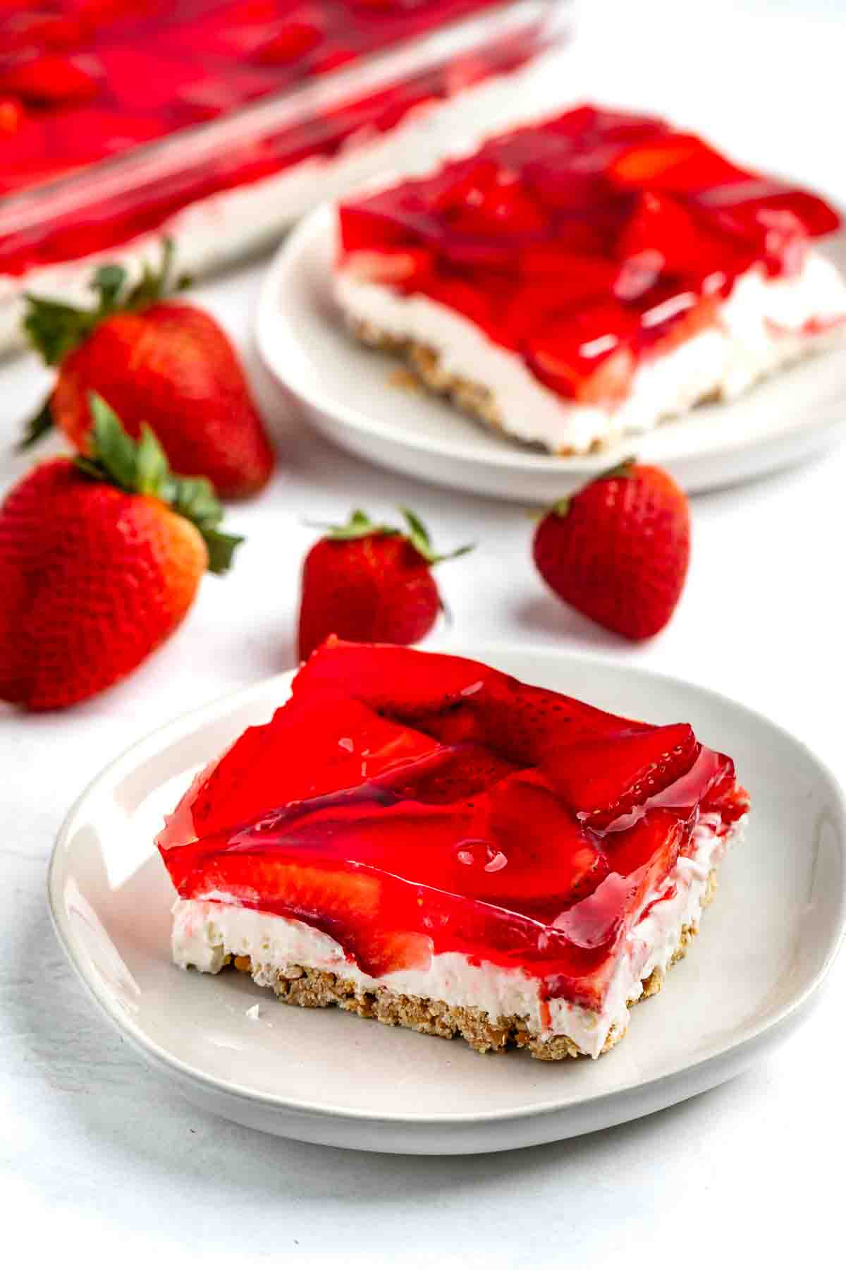 - Assemble the dessert: place the strawberries in a single layer on top of the cream cheese mixture. Carefully pour the cooled Jell-O mixture evenly over the berries and cheesecake. Chill in the fridge until set, at least 3 hours.