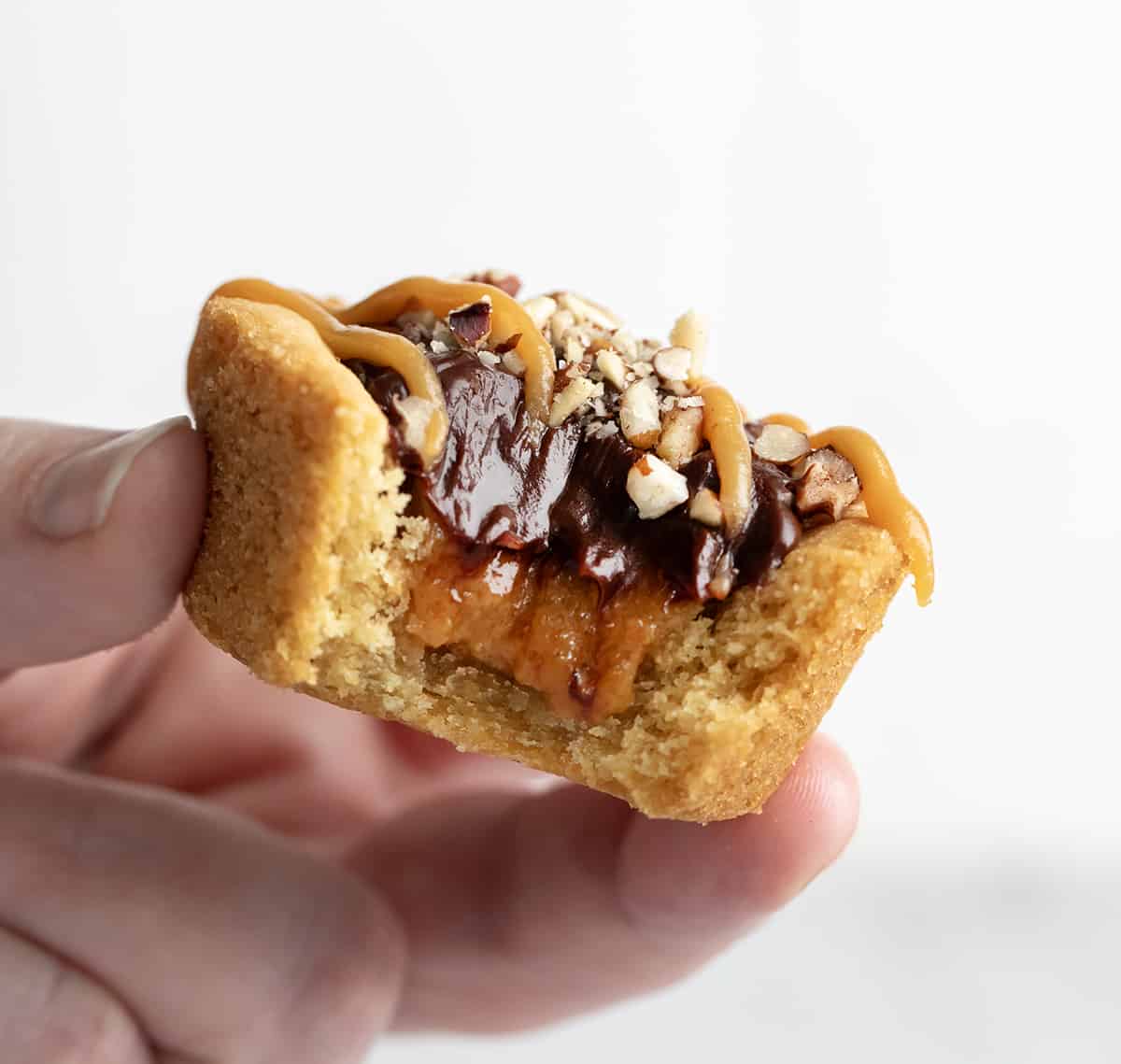 - Remove the cooled cookie cups from the muffin tins. Fill each with 1 tablespoon caramel, 1 tablespoon ganache, and ½ teaspoon chopped pecans.