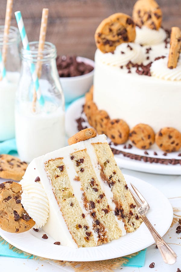 - Assemble cake: Level cakes if necessary, spread frosting between layers, crumble cookies with milk and spread over each layer inside the dam, then frost the outside of the cake. Decorate with mini chocolate chips as desired.