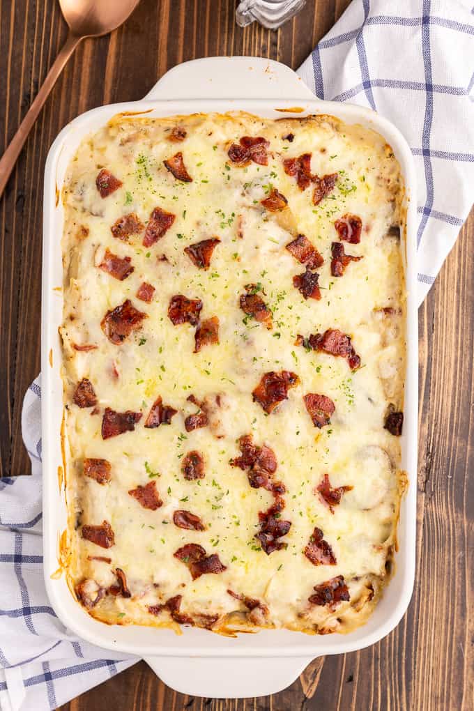 Pop it into the oven and bake for about 45-50 minutes. Check for doneness by inserting a toothpick into the center—it should come out clean. Every oven is a little different, so start checking around 45 minutes. If the top browns too quickly, tent with foil for the last few minutes.