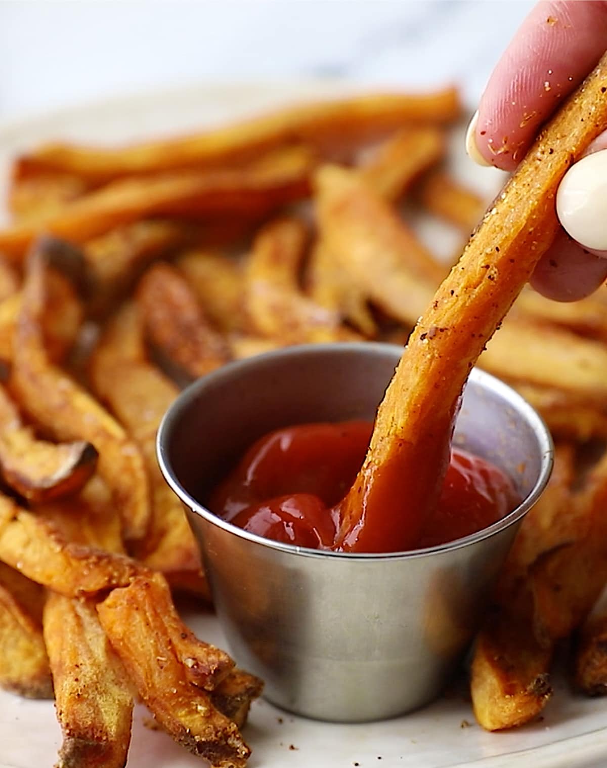 5. Transfer sweet potato fries to a large plate and serve right away with your favorite dipping sauce.