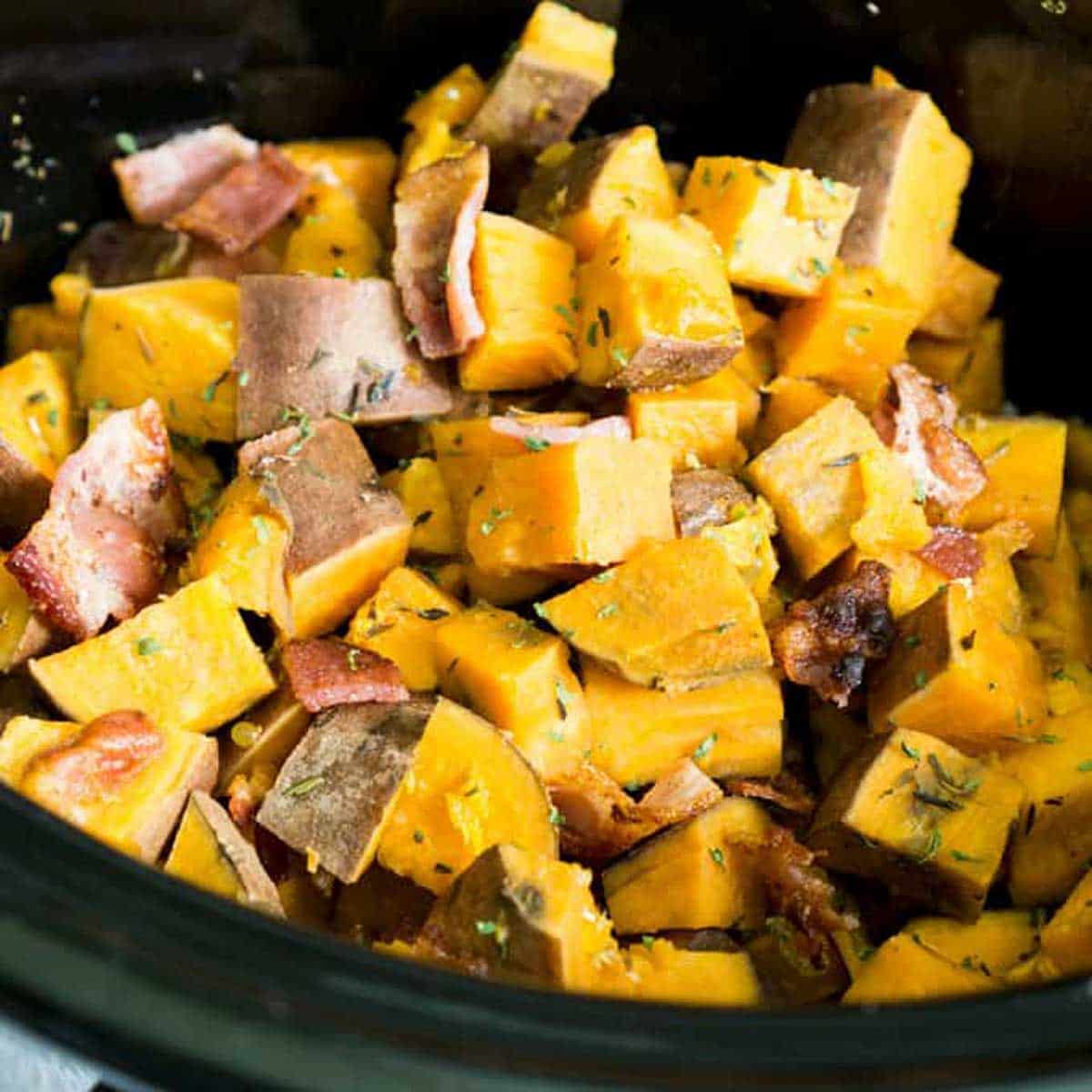 - Place mashed sweet potatoes in the slow cooker. Add brown sugar, butter, milk, and vanilla extract. Mix well.