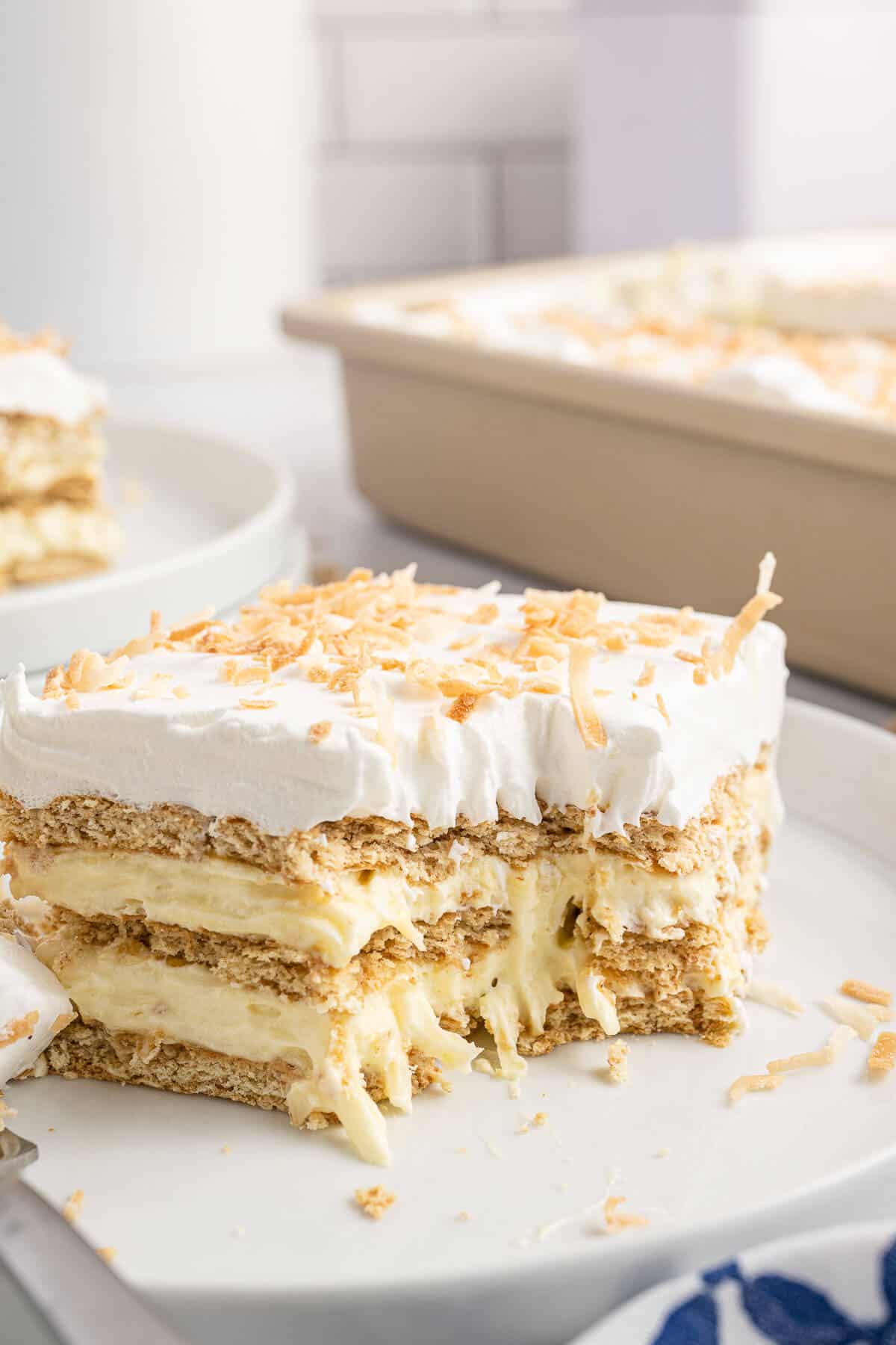 - Layer another 8 to 9 graham crackers over the pudding mix, then cover those with the other half of the pudding mixture.