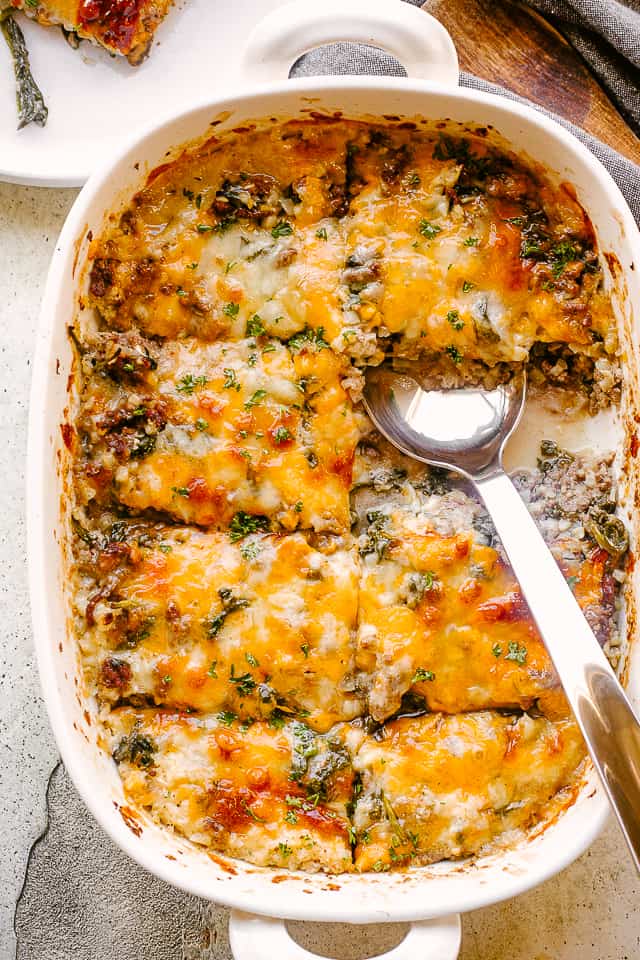 - Add prepared beef mixture to the baking dish; stir until everything is completely incorporated. Top with shredded cheese.