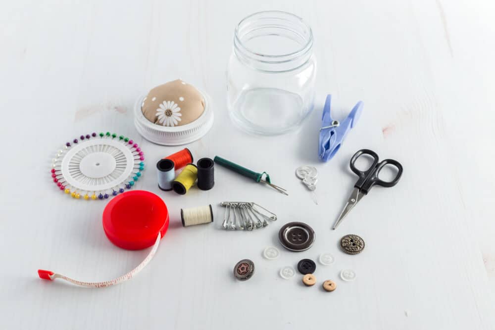 - Arrange the scissors, pins, threads, bobbins, and needles inside the jar.