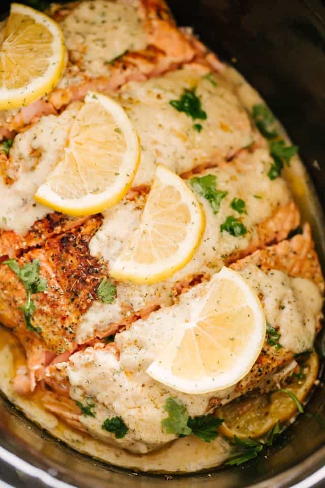 - Pour broth and lemon juice into the slow cooker around the fish. Do not pour over the fish.