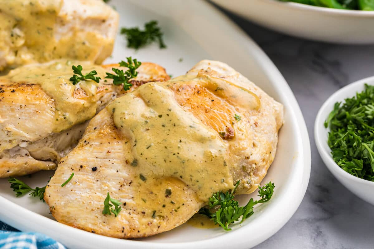 - Add chicken broth to the pan, scraping the bits from the bottom. Whisk in tarragon, Dijon mustard, and milk. Let simmer for 1-2 minutes, whisking constantly, until thickened. Serve over chicken breasts.