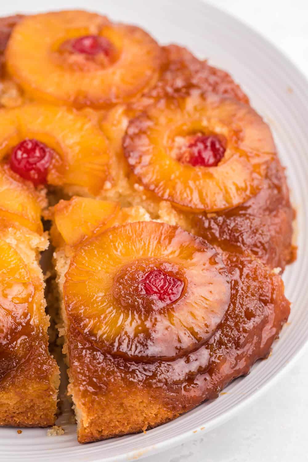 A delicious pineapple upside-down cake with caramelized pineapple and a moist, fluffy cake layer.