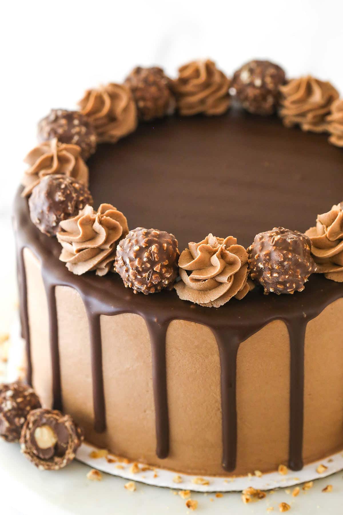 - Pipe remaining frosting around the top edge, decorate with Ferrero Rocher candies.