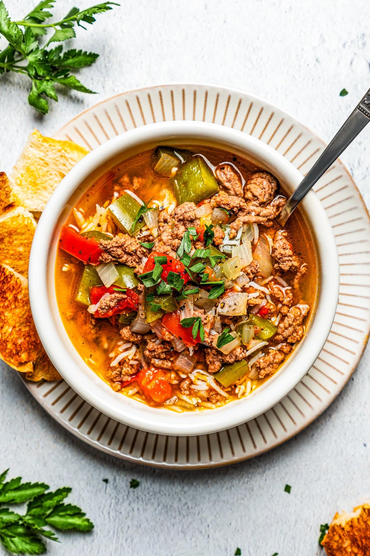 A hearty and flavorful stuffed pepper soup made with ground beef, bell peppers, tomatoes, and rice simmered in a savory broth.