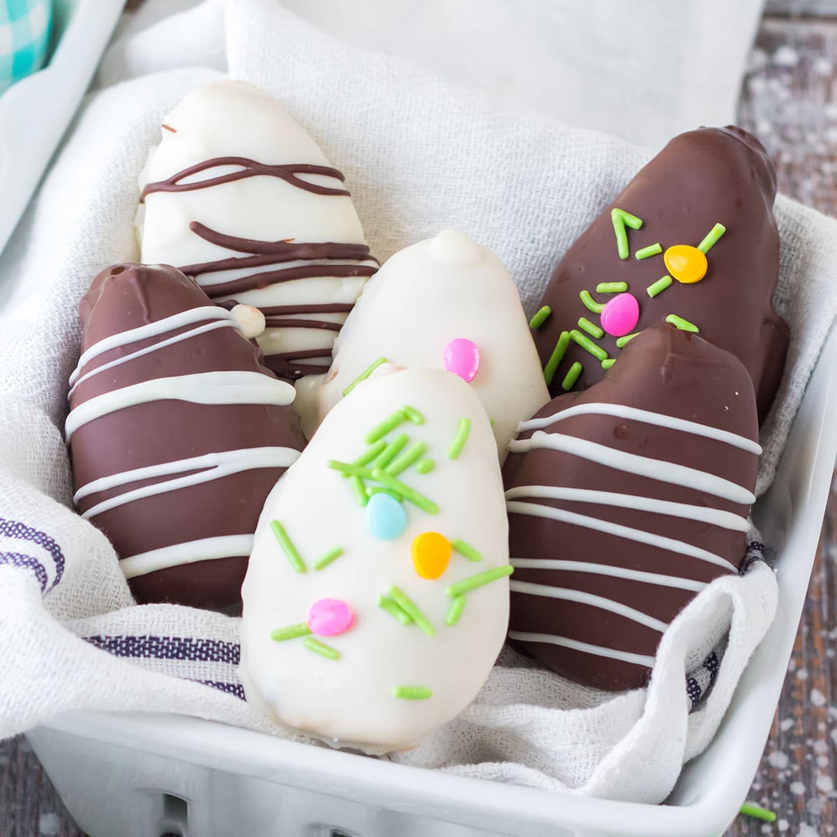 These peanut butter eggs need to be refrigerated because they contain cream cheese. Store them in the refrigerator until you are ready to eat, or if you're putting them in an Easter basket, keep them in the fridge until you're ready to gift them.