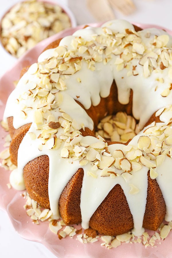 - Drizzle glaze over cooled cake and top with sliced almonds if desired.