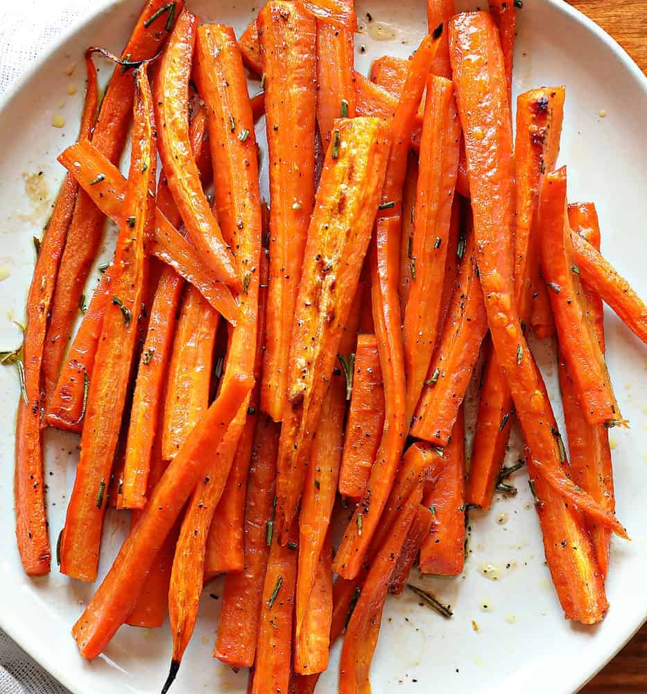 - In a large bowl, toss the carrots with olive oil, salt, black pepper, chopped rosemary, and minced garlic until evenly coated.