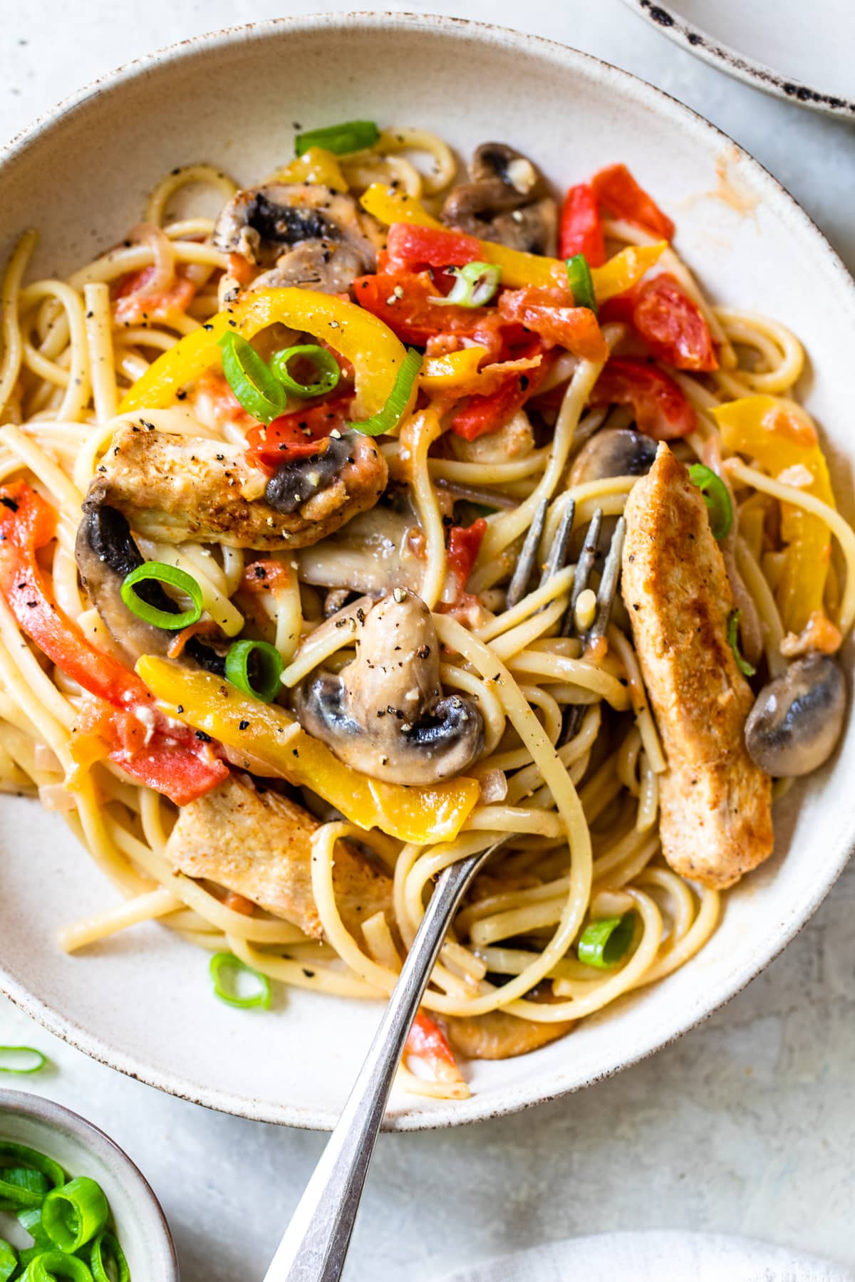 This Cajun Chicken Pasta recipe features tender chicken breast strips, colorful bell peppers, red onion, and mushrooms, all coated in a creamy, light, and flavorful Cajun sauce. A delicious and satisfying meal for any night of the week.