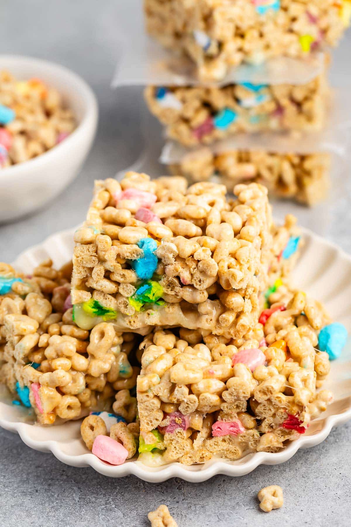 - Add the Lucky Charms cereal to the marshmallow mixture and stir gently until the cereal is fully coated. Pour the mixture into the prepared pan. Press firmly to compact. (Tip: Spray wax paper or your hands with nonstick cooking spray to prevent sticking when pressing down).