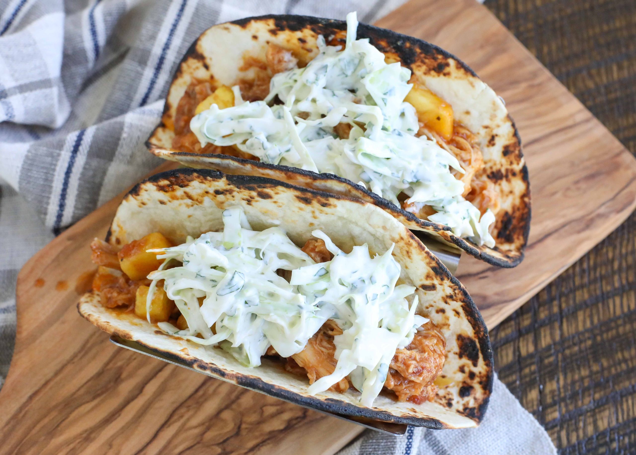 - Heat the tortillas in a cast-iron skillet over medium-high heat for 15-30 seconds, until they are lightly browned and toasted. To serve, add the chicken with a little sauce to a warm tortilla. Top with Cilantro Slaw and serve immediately.