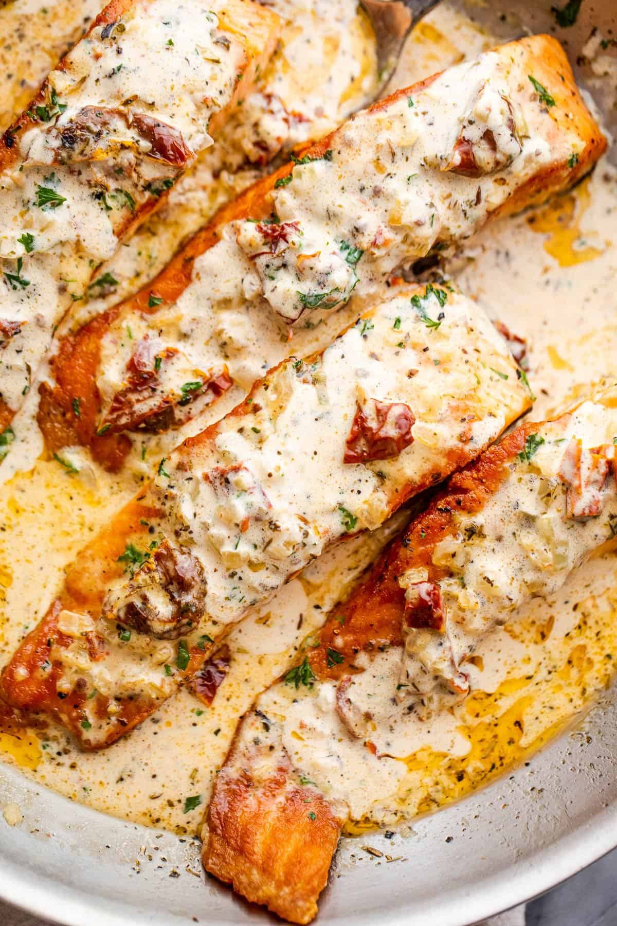 - Remove the skillet from the heat and let it rest for a few minutes. The sauce will continue to thicken as it cools. Then, spoon the sauce over the salmon fillets, garnish with parsley, and serve.