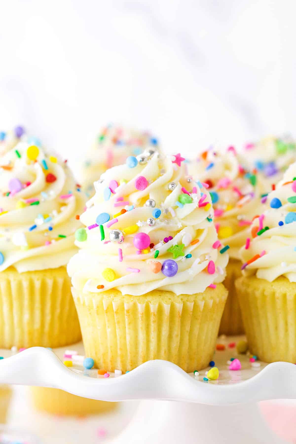 Delicious fluffy vanilla cupcakes topped with creamy vanilla buttercream.
