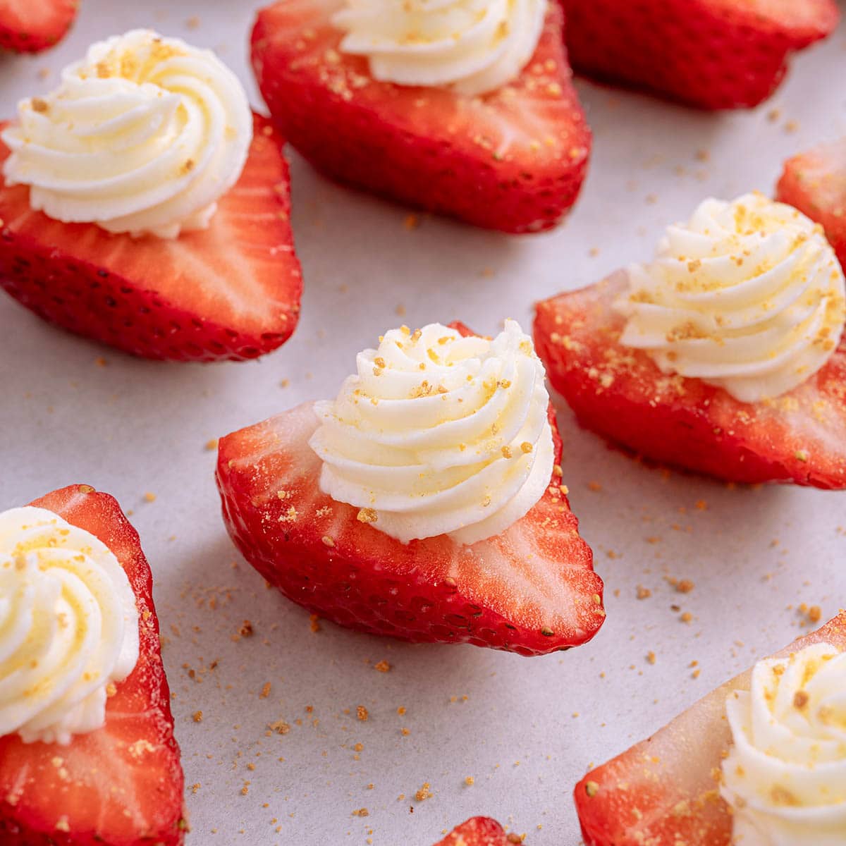 - Pipe or spoon the cheesecake filling onto the sliced strawberries.