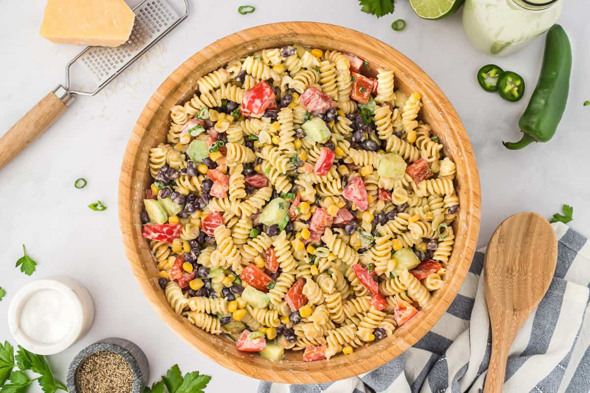 - In a large bowl, add cucumbers, red pepper, tomatoes, and corn; stir gently to combine. Add pasta and black beans, fold to combine. Add cheese, green onions, salt and pepper; folding again to combine.