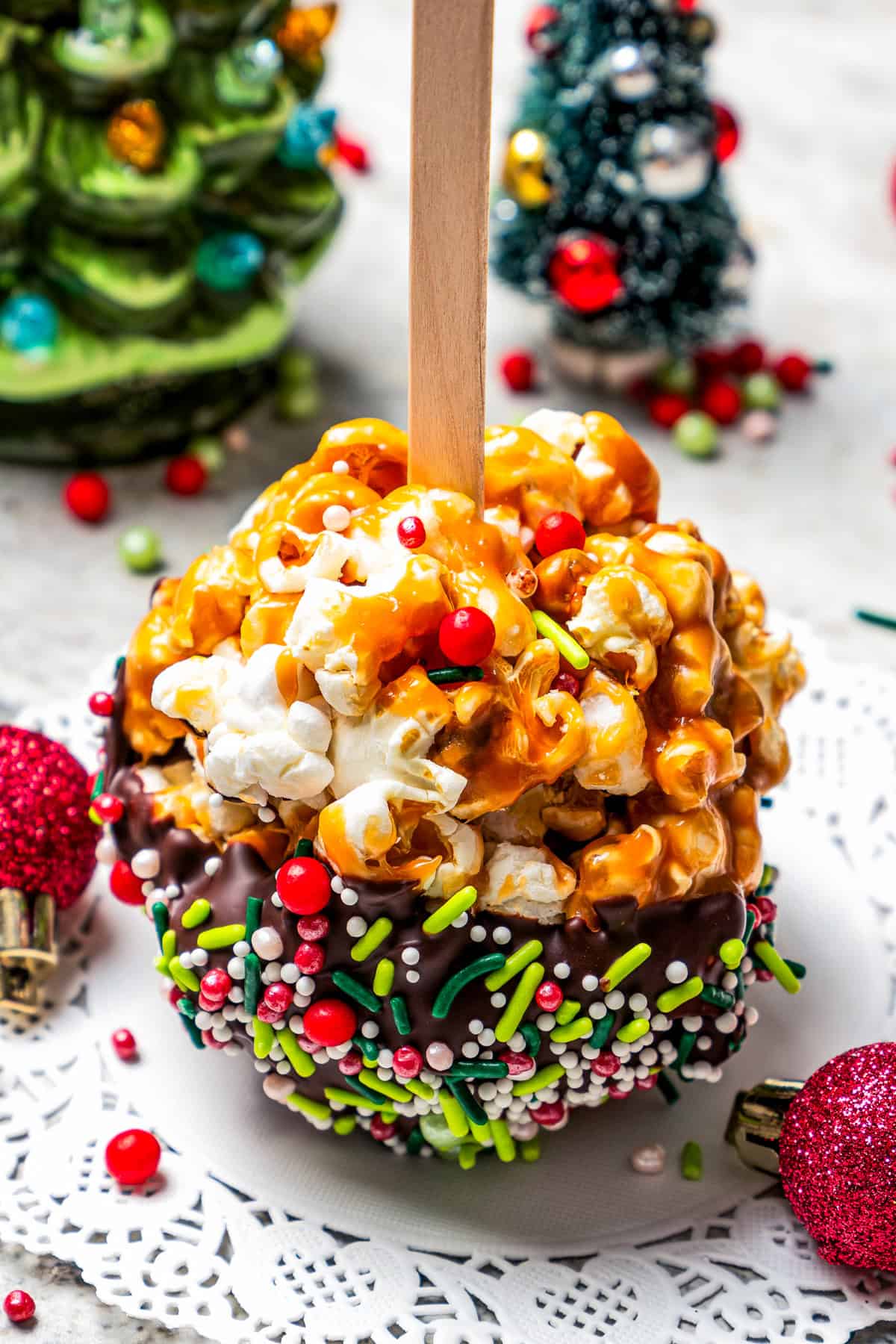 - Dip! Insert a popsicle stick into each popcorn ball and dip into melted chocolate, then sprinkle with decorations. Place on wax paper until the chocolate is set. Serve.