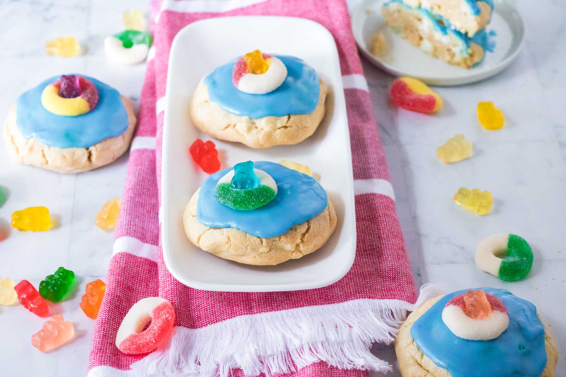 Fun and festive pool party cookies perfect for summer celebrations. These cookies feature a creamsicle flavor base topped with blue icing to resemble a swimming pool and gummy candy for a playful touch.