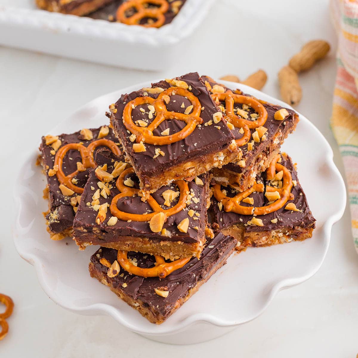 - Sprinkle crushed peanuts and some intact pretzels over the chocolate layer for added crunch and visual appeal.